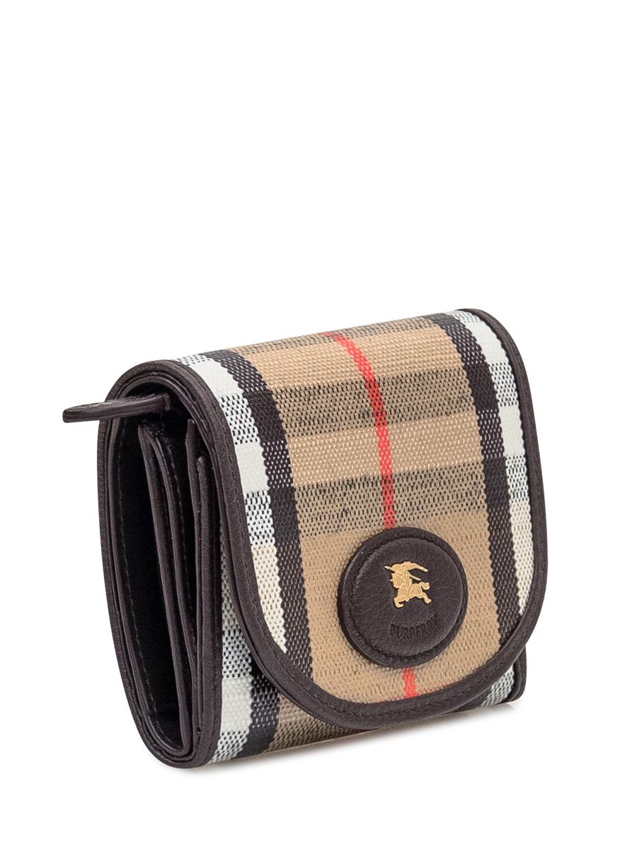 Burberry compact wallet in classic tartan fabric with brown leather trim and gold logo. Width: 12Height: 9Depth: 3