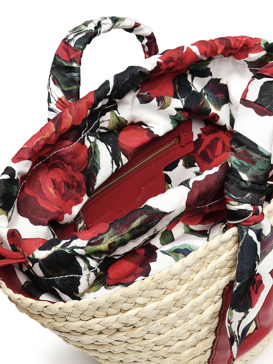 Double handle finished in contrast, leather drawstring closure, contrasting floral patterns, front logo, double hook closure \ 35x28x16cm