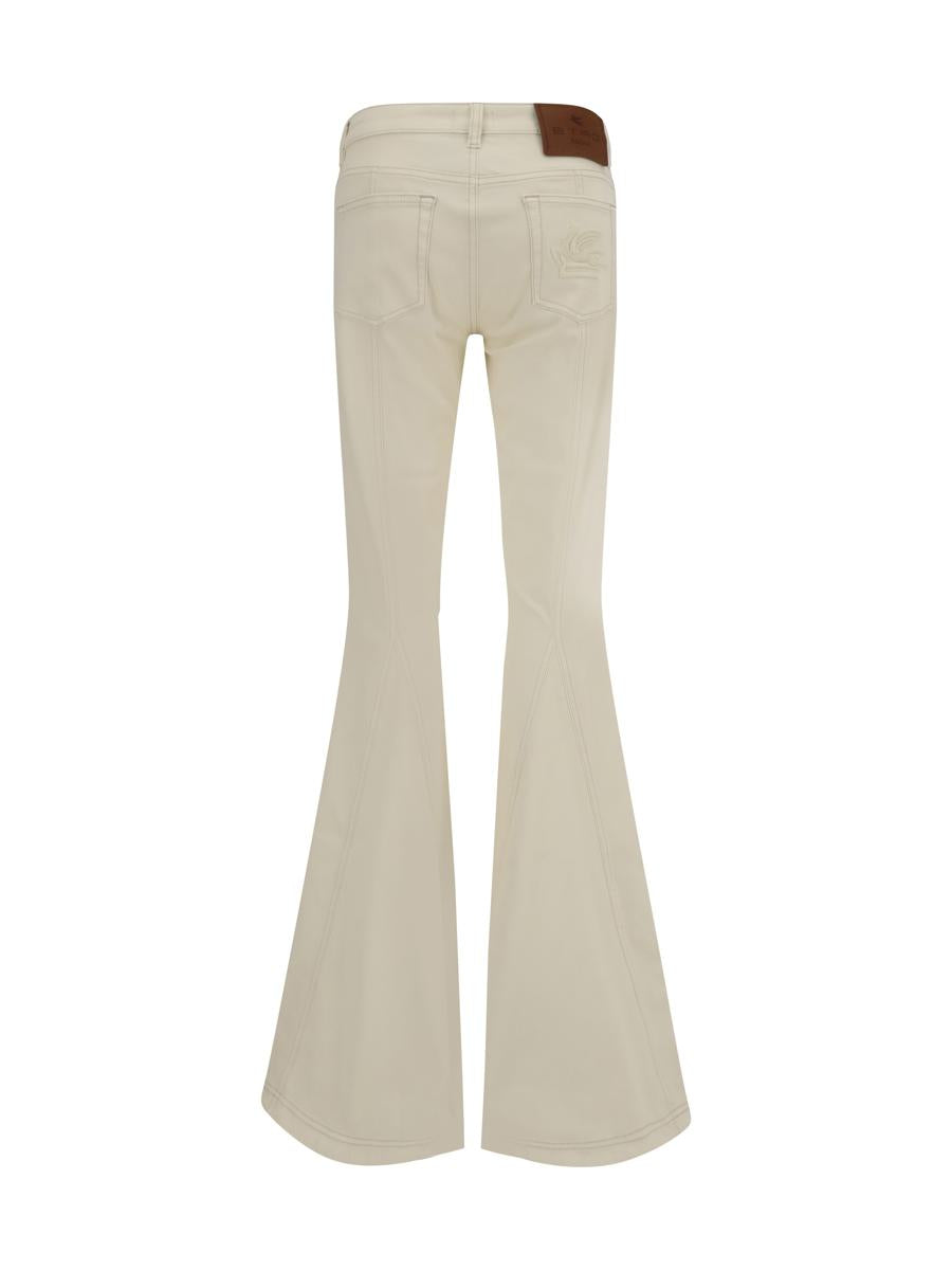 ETRO'S FLARE PANTS REINTERPRET A TIMELESS CLASSIC WITH THE BRAND'S UNMISTAKABLE STYLE. MADE IN THE TRADITIONAL FIVE-POCKET PATTERN, THEY FEATURE A FRONT ZIPPER AND BUTTON CLOSURE, WAIST LOOPS AND THE ICONIC EMBROIDERED LOGO ON THE BACK, A DISTINCTIVE DETAIL THAT ENHANCES THEIR IDENTITY.