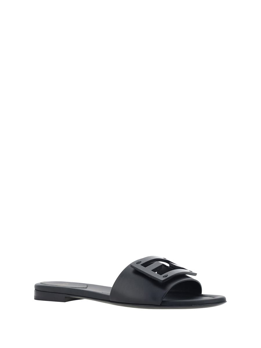 LEATHER FF SANDALS FROM FENDI FEATURING OPEN TOE, THREE-DIMENSIONAL PLAQUE WITH ICONIC FF LOGO APPLIQUE ON FRONT, SLIP-ON STYLE.