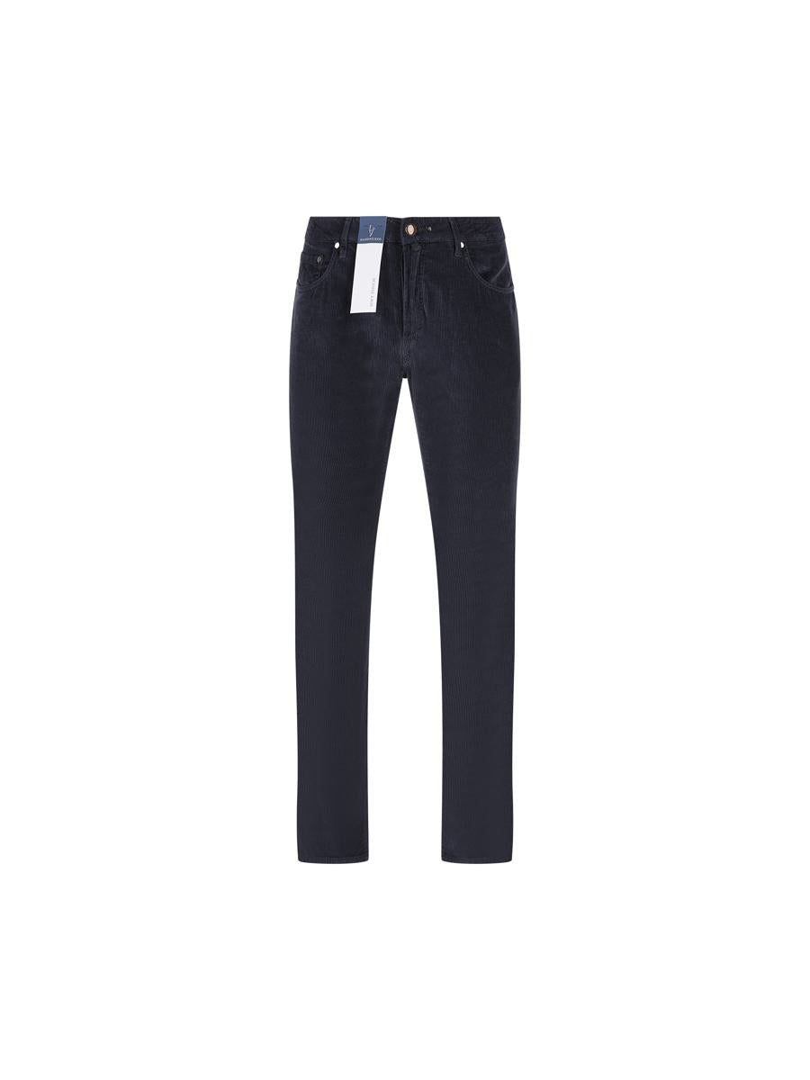 Strong character and contemporary sophistication come together in the Ravello trouser by Handpicked. Made of thousand-striped velvet, this style offers a rich and pleasantly warm texture, ideal for the colder seasons. The deep, intense Abyss Blue hue adds a touch of sophisticated versatility to a man's wardrobe. The regular fit ensures a comfortable yet defined fit, while details such as the button closure and suede back salpa enhance the fine craftsmanship. A perfect garment for smart-casual and formal looks with personality. - Material: thousand-striped velvet - Color: Abyss Blue - Button closure - Suede back flap - Item number: RAVELLO_C830