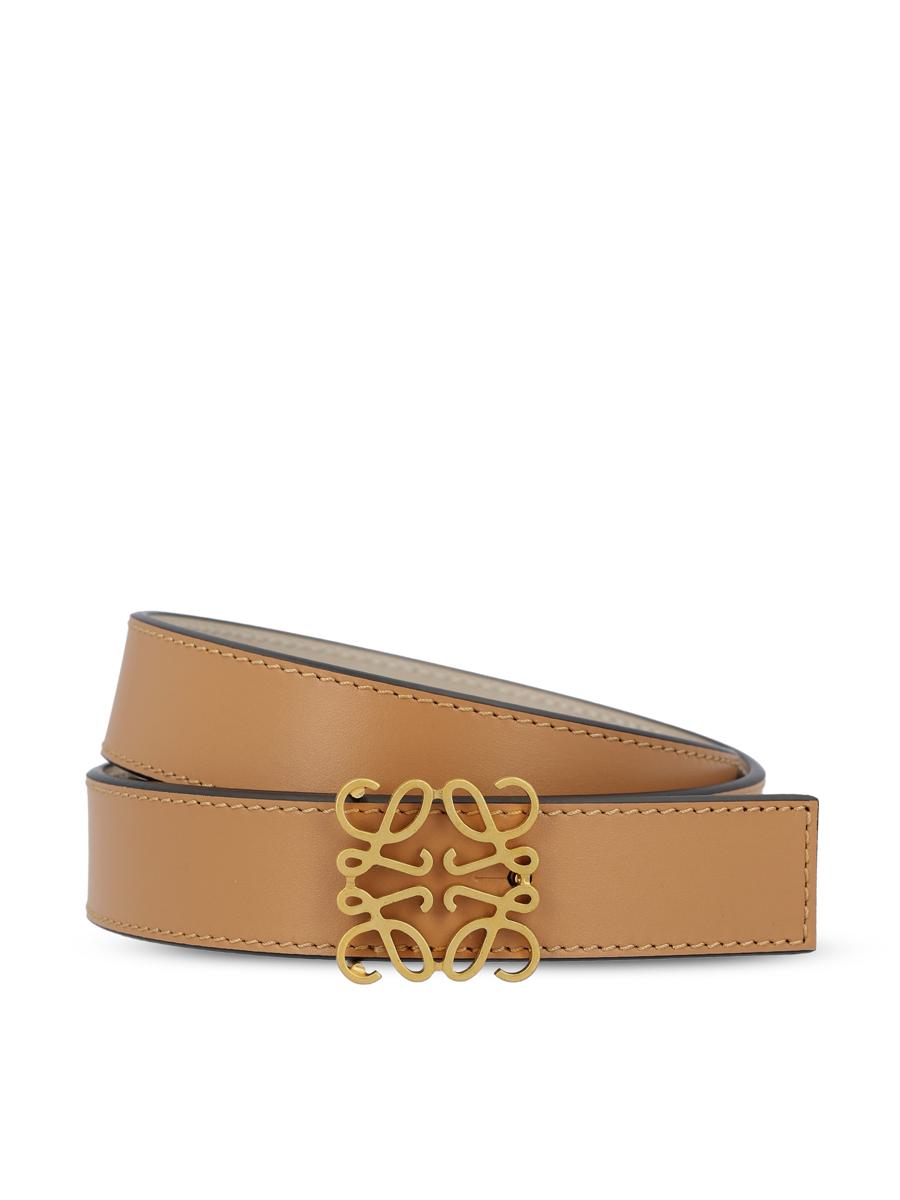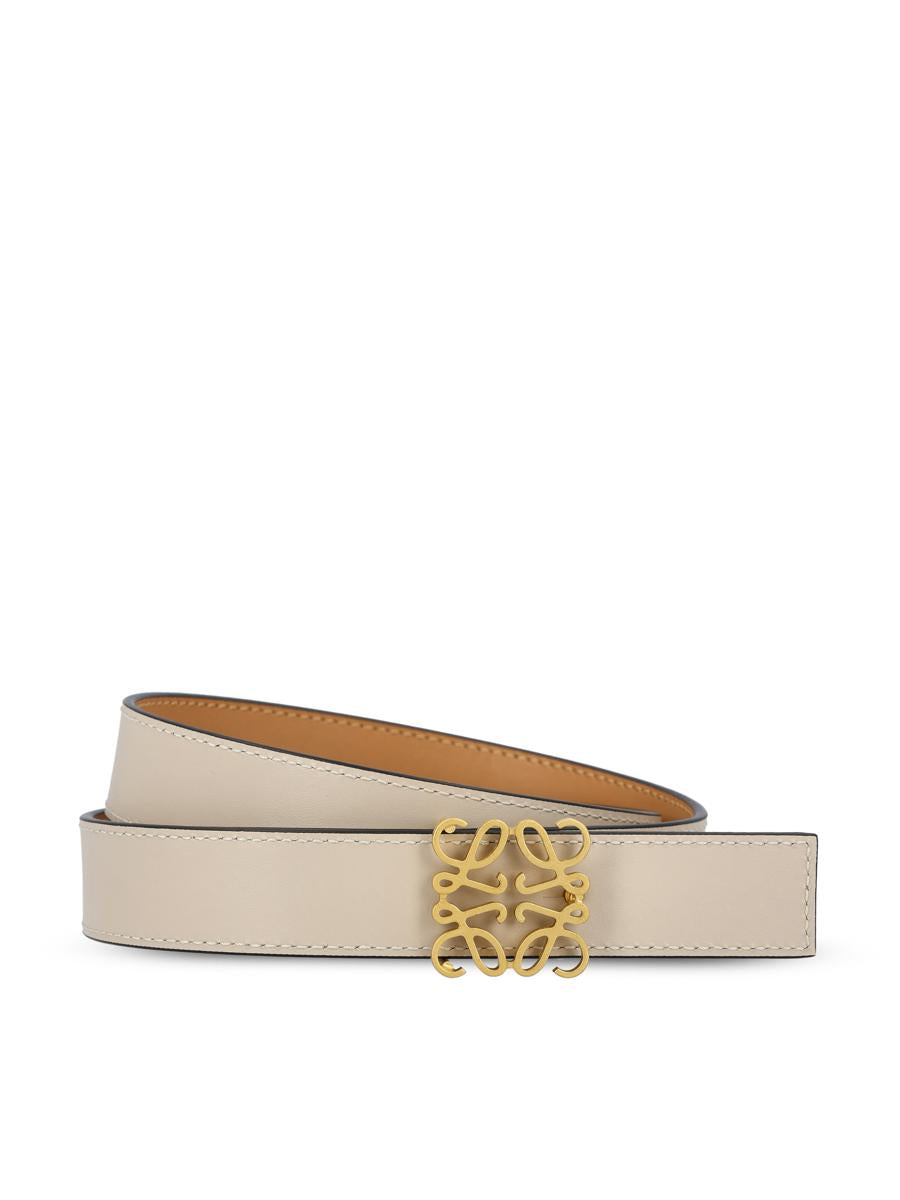 Loewe's Anagram belt is a reversible luxury accessory that blends functionality and design. With double smooth brown and black leather finish and sculptural golden buckle with Anagram logo, it is perfect for completing formal or casual outfits. - Material: 100% calfskin leather - Color: beige/white - Loewe buckle and five holes for adjustment - Dust bag - Item number: E821Z26X032965