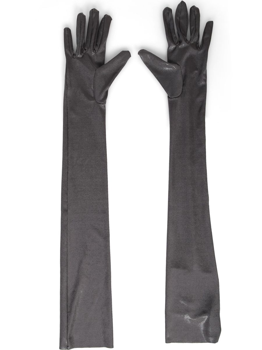These elegant long gloves by Norma Kamali, crafted in a sophisticated grey fabric, feature a snug design that enhances the silhouette. Ideal for adding a touch of class to any evening outfit.