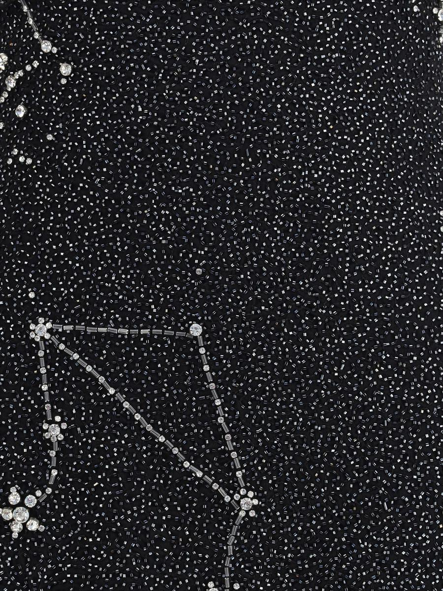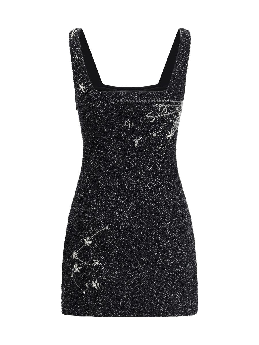 STAUD'S LE SABLE SHORT DRESS, AMONG THE BRAND'S MOST BELOVED, RETURNS IN A SPECIAL VERSION FOR THE HOLIDAYS WITH A REFINED CONSTELLATION-INSPIRED MOTIF. ENTIRELY DECORATED WITH HANDMADE BEADS, IT IS EMBELLISHED WITH AN ELEGANT SLIT AND A HIDDEN SIDE ZIPPER THAT COMPLETES THE SOPHISTICATED DESIGN.